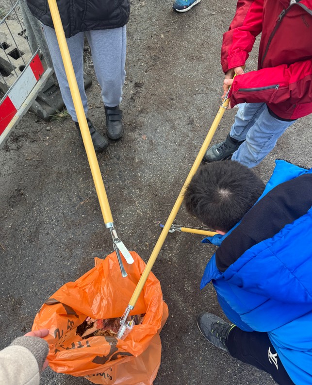Im Unterricht haben wir bereits geübt, wie man mit einer Greifzange Gegenstände aufhebt. Am Montag waren wir dann bereit. Wir zogen uns Handschuhe an und nahmen die Greifzangen und Müllsäcke mit.